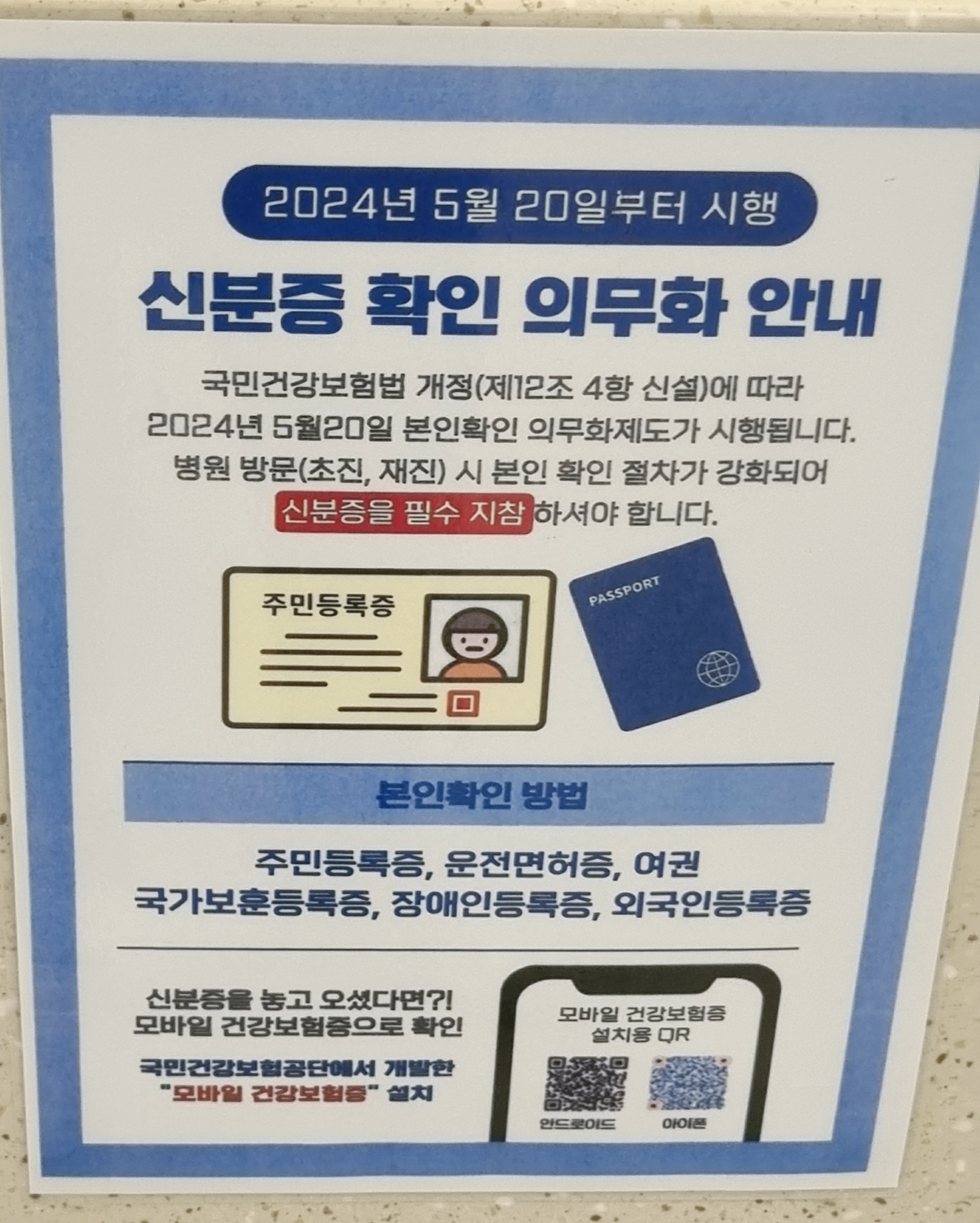 5월 20일부터 신분증과 건강보험 가격이 확인되지 않는다면 병원에서 진료를 받더라도 건강보험이 적용되지 않을 수 있습니다.