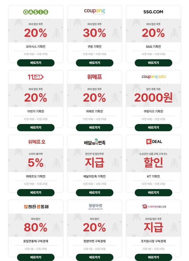 - 상생 기획전에는 평소에 많이 이용하는 온라인 쇼핑몰인 쿠팡 , SSG , 오아시스 , 11번가, 위메프, 배달의 민족 등등