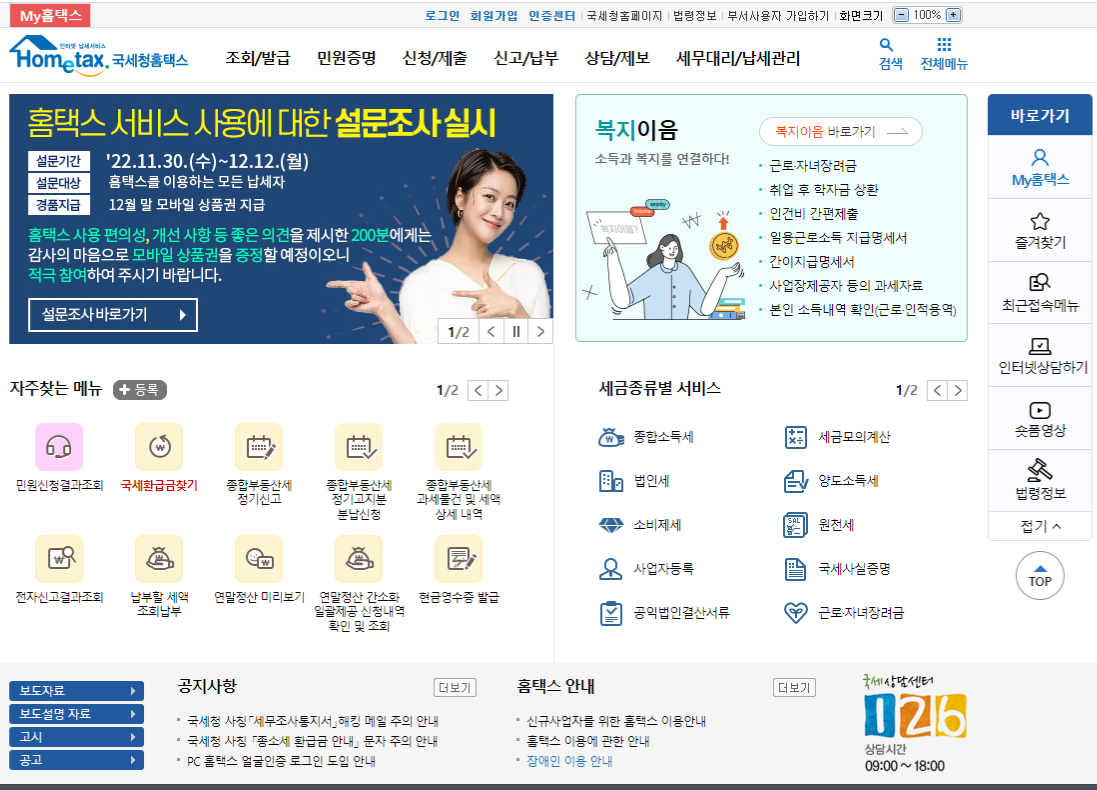 2023.01.15 ~ 2023.02.15 기간에 국세청 홈택스 연말정산 간소화 서비스에서 신용카드 내역, 의료비, 교육비, 보험료 등 각종 지출내역이 잘 정리되어 손쉽게 자료들을 확인할 수 있습니다. 연말정산 간소화 서비스는 회원가입 없이 공인인증서를 통하여 본인인증만으로 이용할 수 있습니다.
