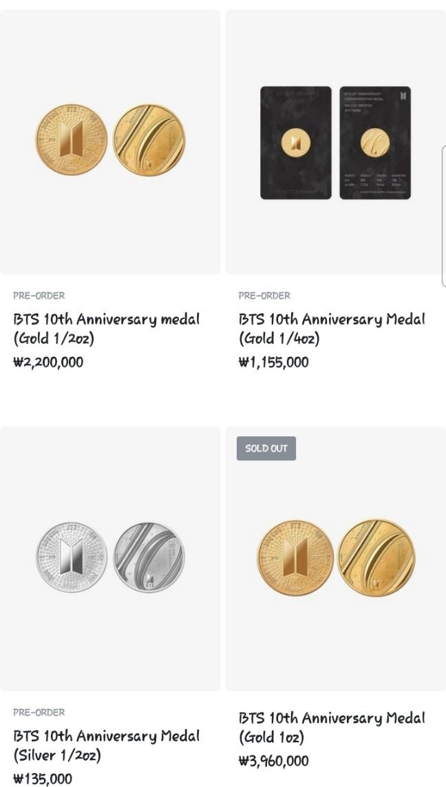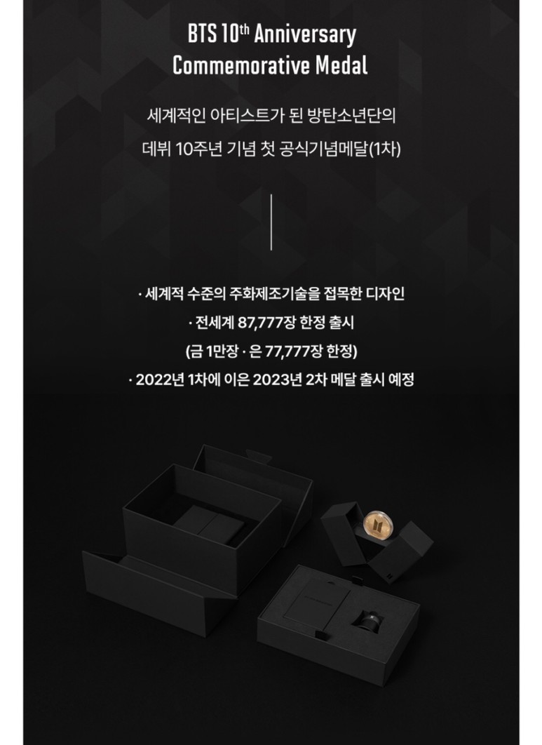 한국 조폐공사와 방탄소년단(BTS) 소속사 하이브는 방탄소년단(BTS) 데뷔 10주년을 축하하고 기념하기 위해 기념 메달을 16일 국내외에서 동시에 출시하였다.